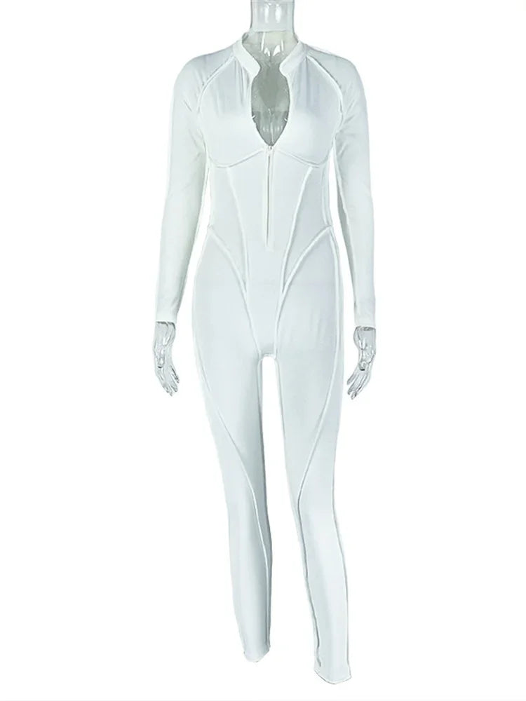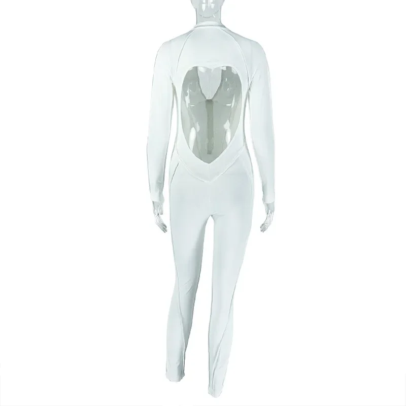 Casual Sporty Jumpsuits Women Zip Low-Neck Backless Full Sleeve Skinny Peach Hip High Street Style Solid Overalls