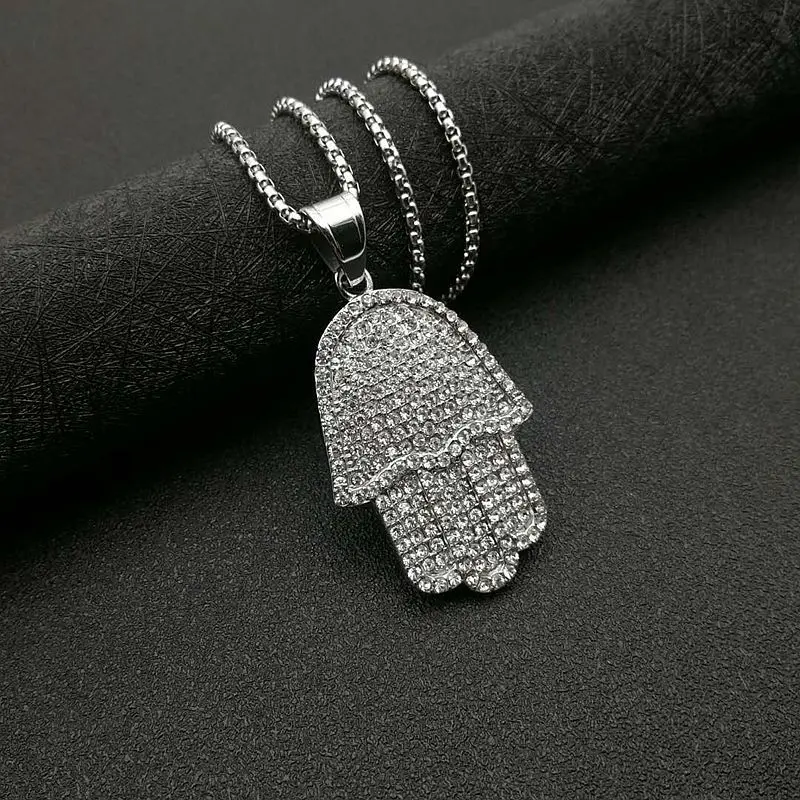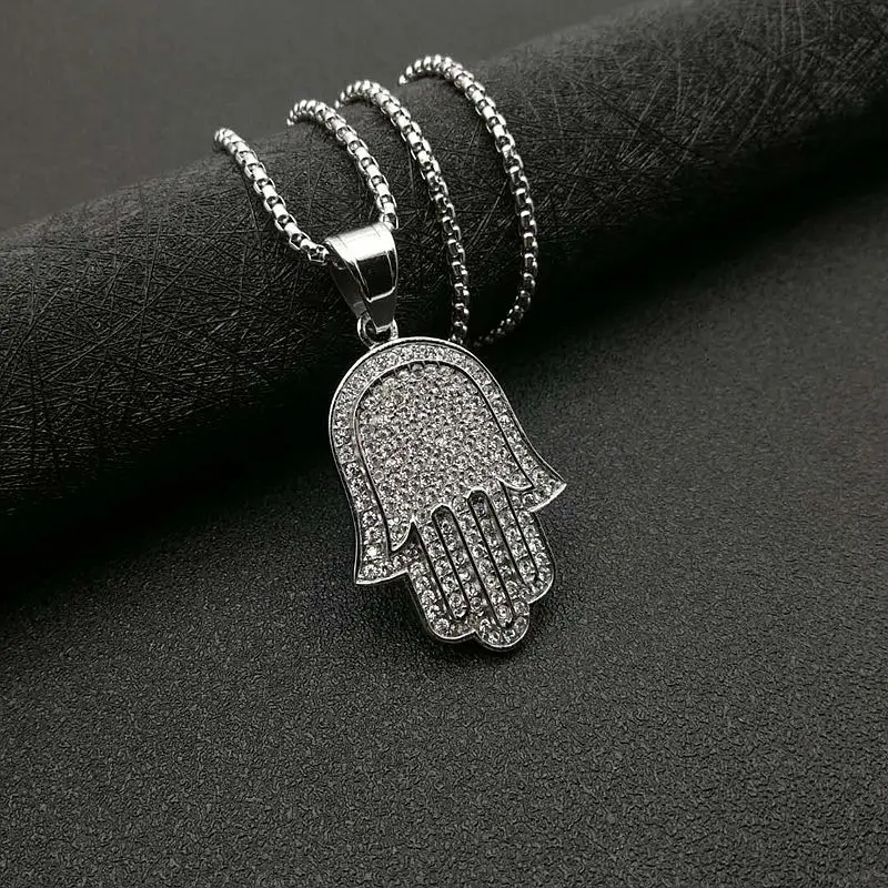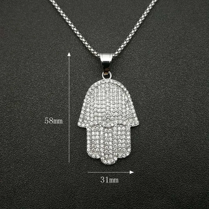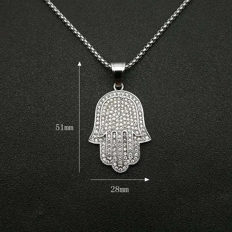 Hip Hop Full Zircon Pave Bling Iced Out Fatima Hand Pendants Necklace Mens Gold Color 316L Stainless Steel Chain Jewerly