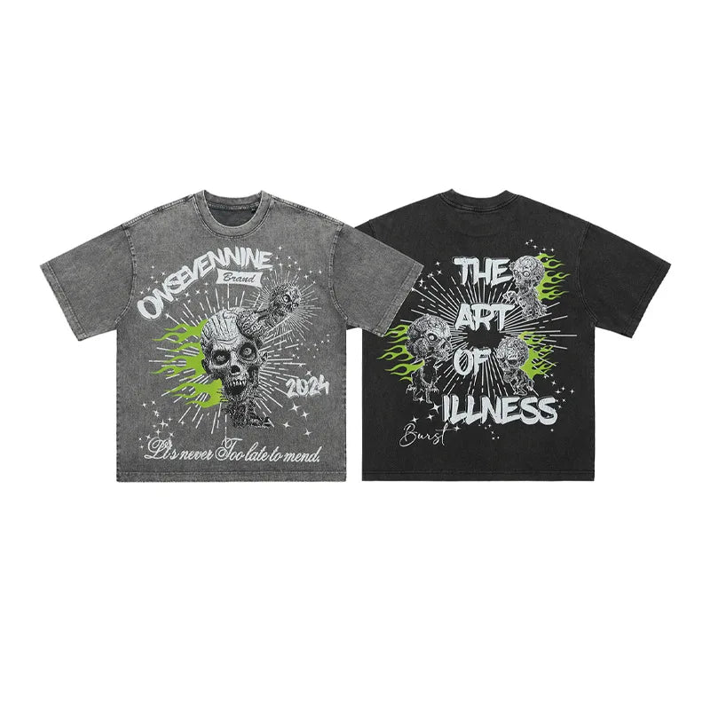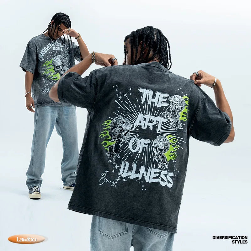 LawFoo American trendy brand washed retro old large print pure cotton short-sleeved T-shirt men and women street hip-hop