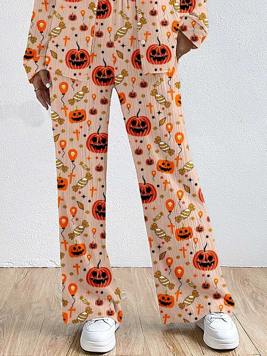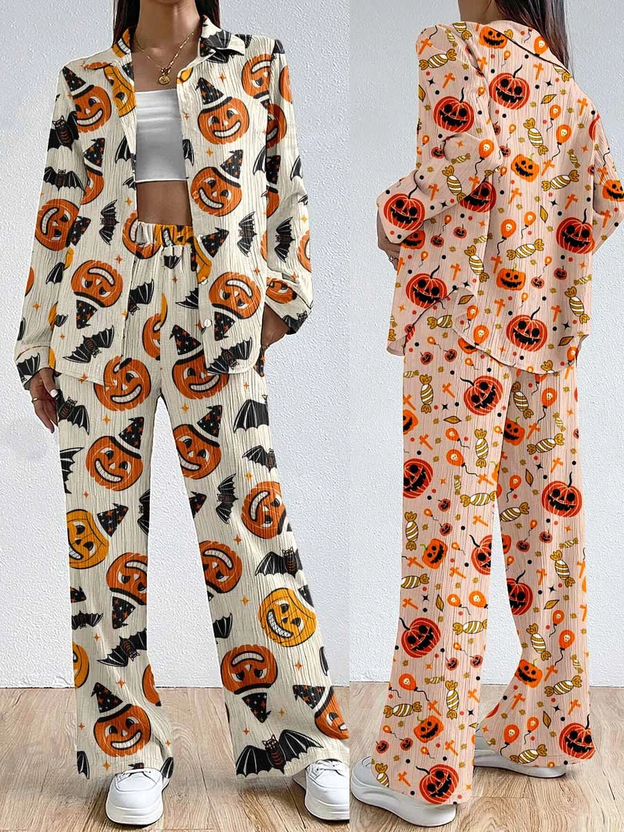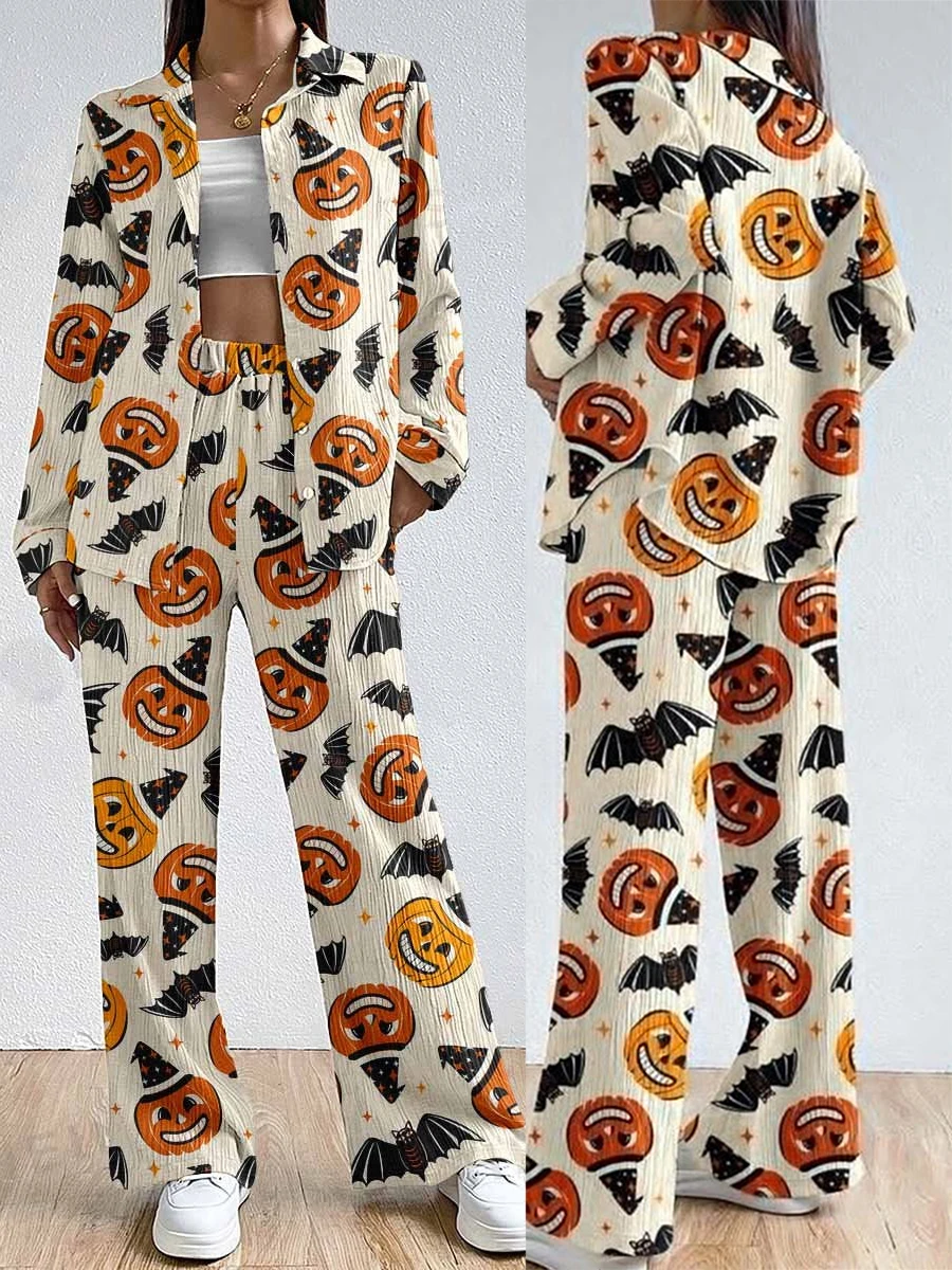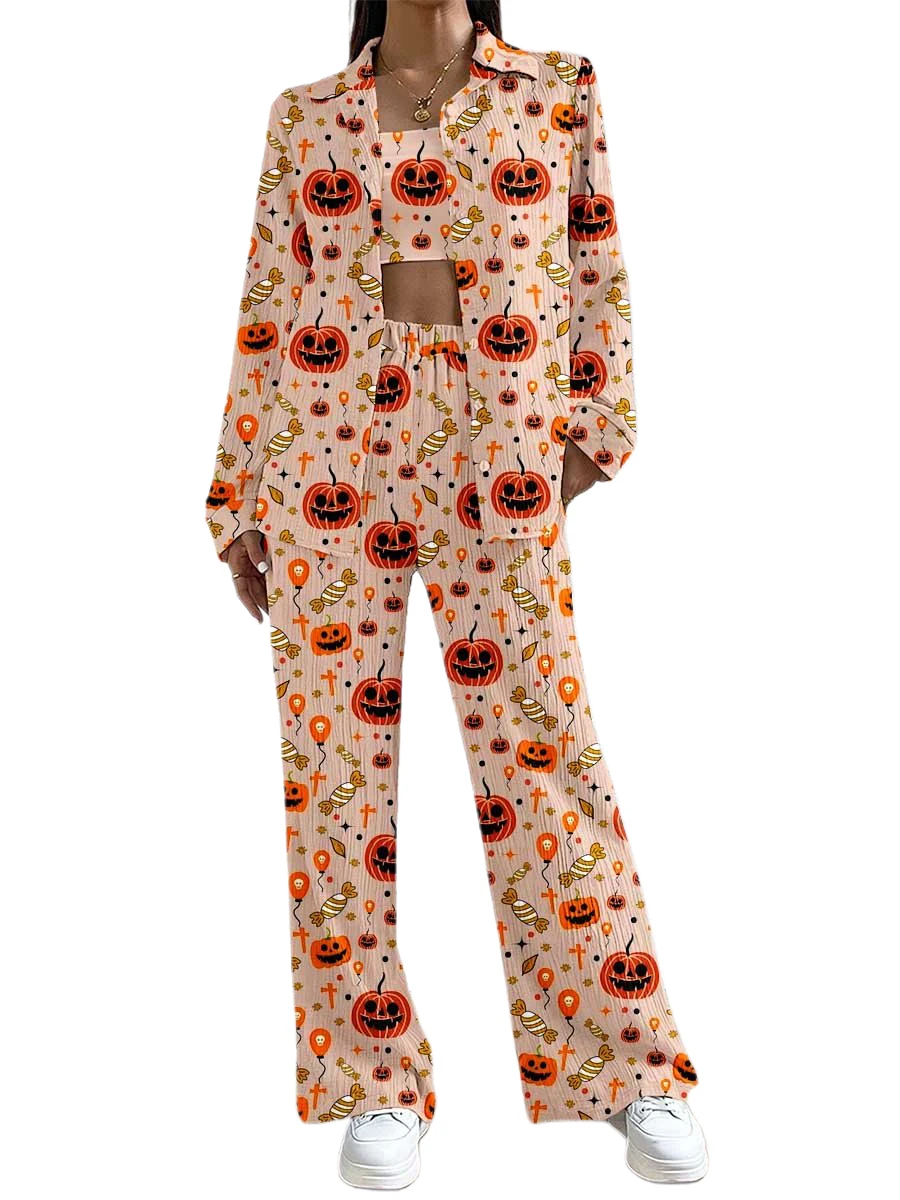 Women Halloween Pajama Set Pumpkin Bat Print Long Sleeve Top with Pants Sleepwear Loungewear