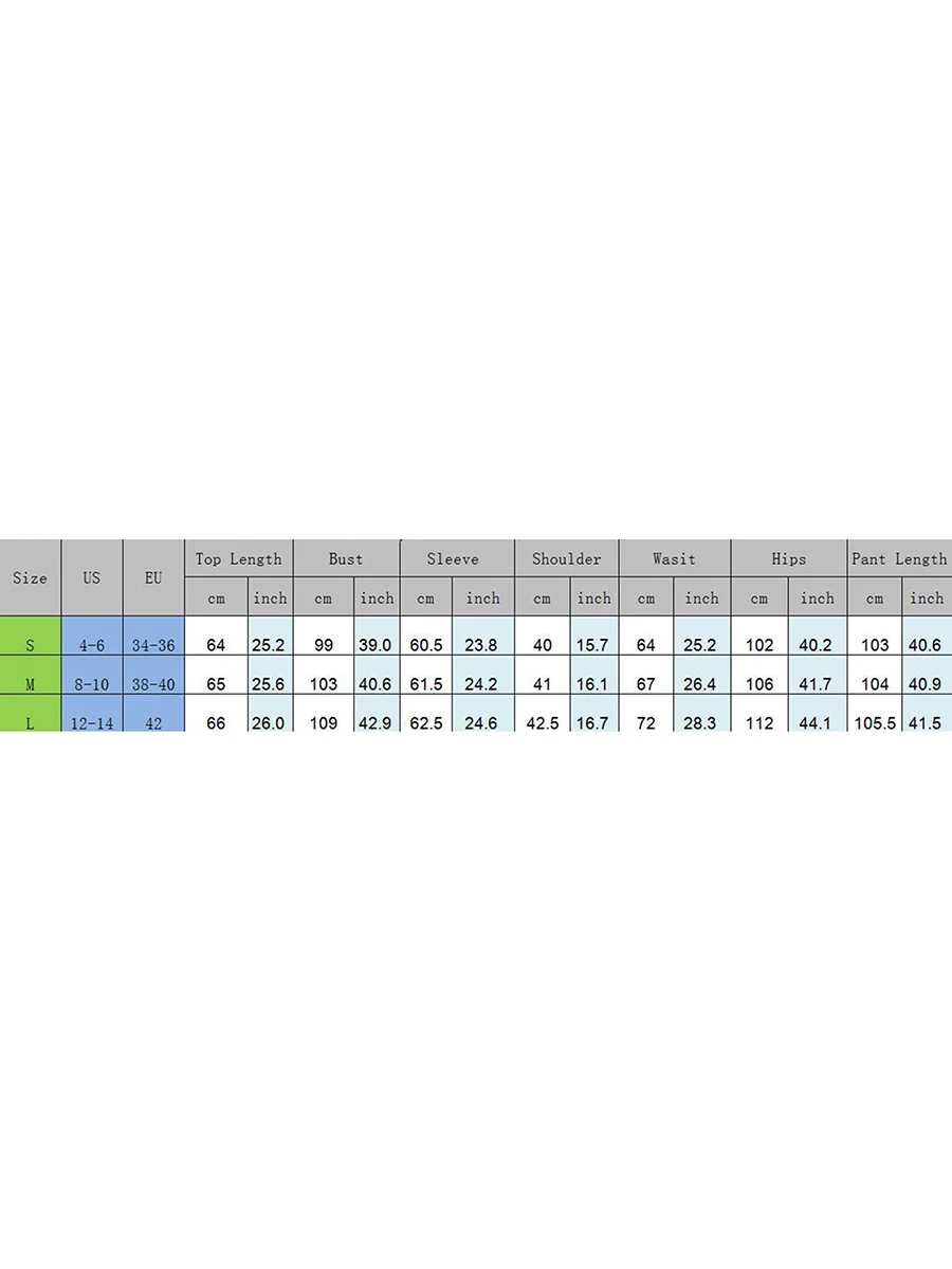 S Tops Length: 25.2 Bust: 38.98 Sleeve: 23.82 Shoulder: 15.75 Pants Length: 40.55 Waist: 25.2 Hip: 40.16