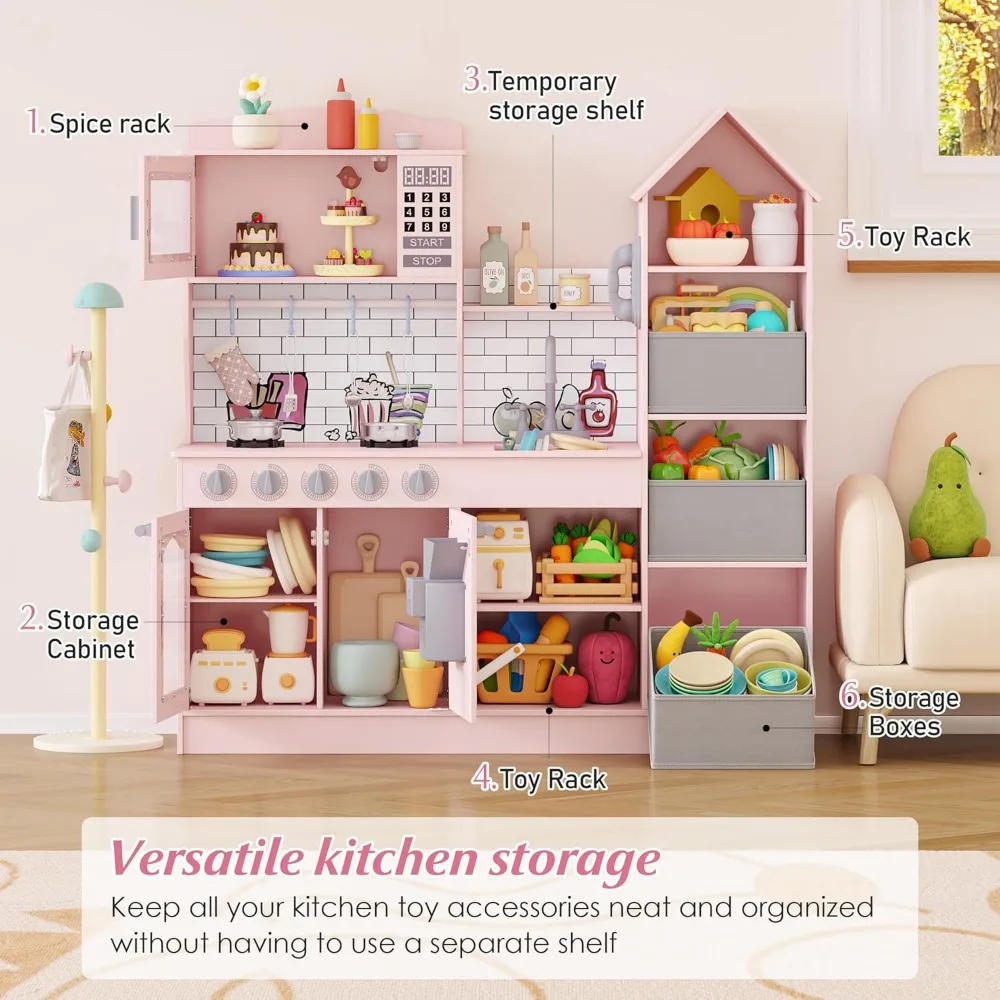 Wooden Play Kitchen for Kids, Playset Chef Pretend with Storage System, Realistic Appliances, Smart Storage & 15 Fun Accessories